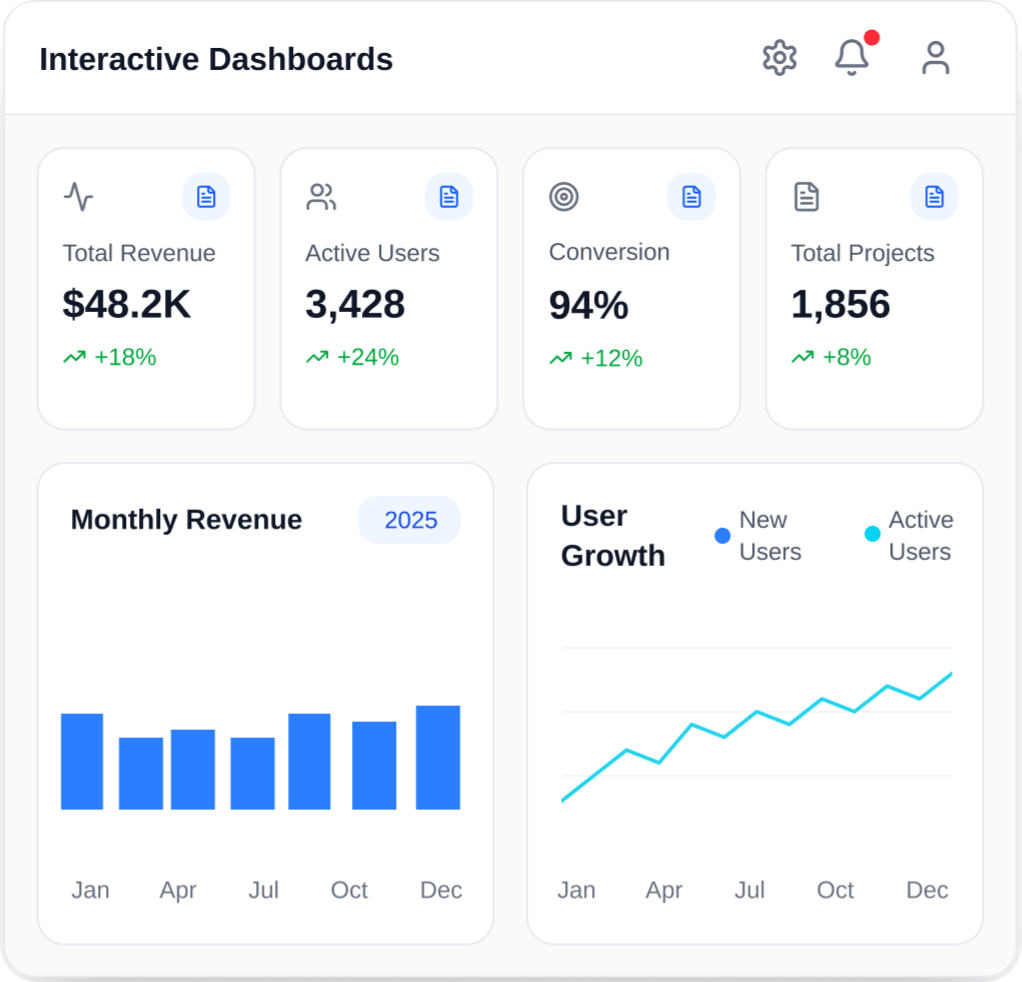 Özelleştirilebilir panolar ve interaktif grafiklerle tüm operasyonunuzu tek ekranda görün. KPI takibi yapın, trendleri izleyin ve veriyi uygulanabilir içgörüye dönüştürün.
